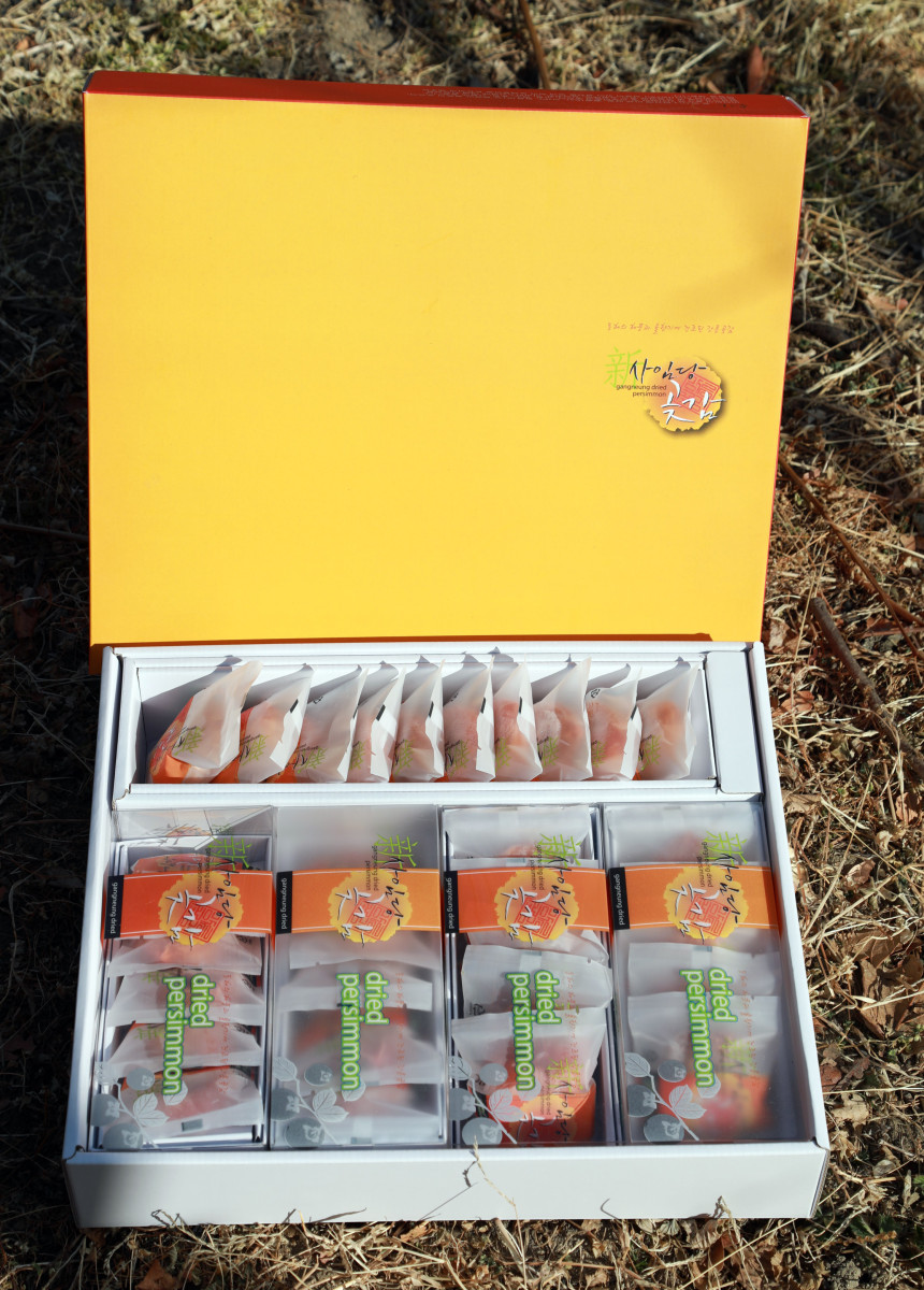 반건시가 아닌 완전 건시로 수분함량 35% 이하이며 개당 무게는 45g 이상이며 당도는 45~ 75브릭스며 박스에는 30개 들어 있습니다.