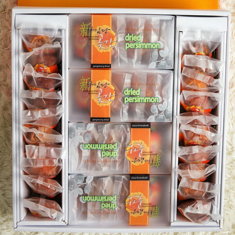 반건시가 아닌 완전 건시로 수분함량 35% 이하이며 개당 무게는 55g 이상이며 당도는 45~ 75브릭스며 박스에는 40개 들어 있습니다.