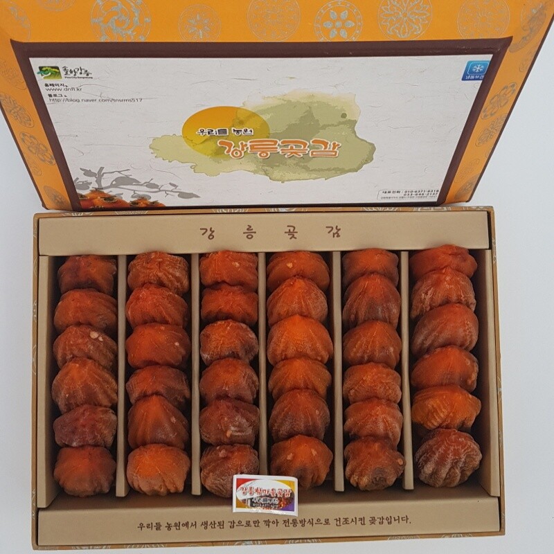 반건시가 아닌 완전 건시로 수분함량 35% 이하이며 개당 무게는 65g 이상이며 당도는 45~ 75브릭스며 박스에는 36~42개 들어 있습니다.